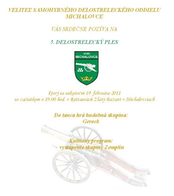 Veliteľ shdo pplk. Ing. Andrej Staško Vás srdečne pozýva na 5. delostrelecký ples, ktorý sa uskutoční dňa 19. februára 2011 v priestoroch reštaurácie Zlatý Bažant. Lístky v cene 25,- EUR si môžete zakúpiť v kancelárií NFeS, od 03.1.2011 - do 10.02.2011. Informácie na tel. čísle : 0960 541 205 .
